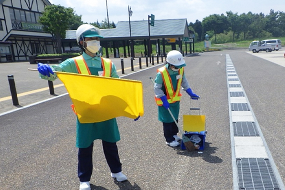 高速道路を快適にご利用いただけるよう、本線路面などの清掃作業や、サービスエリア・パーキングエリアにおけるトイレ・園内の清掃を請負っております。